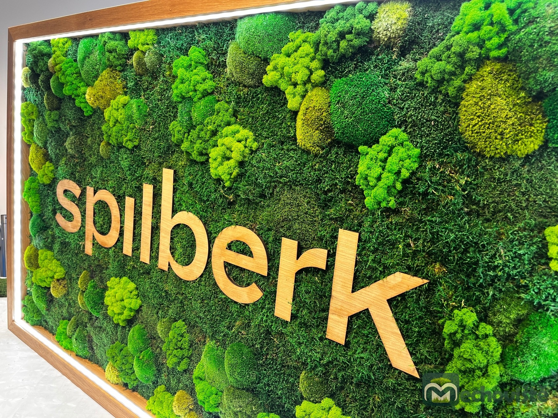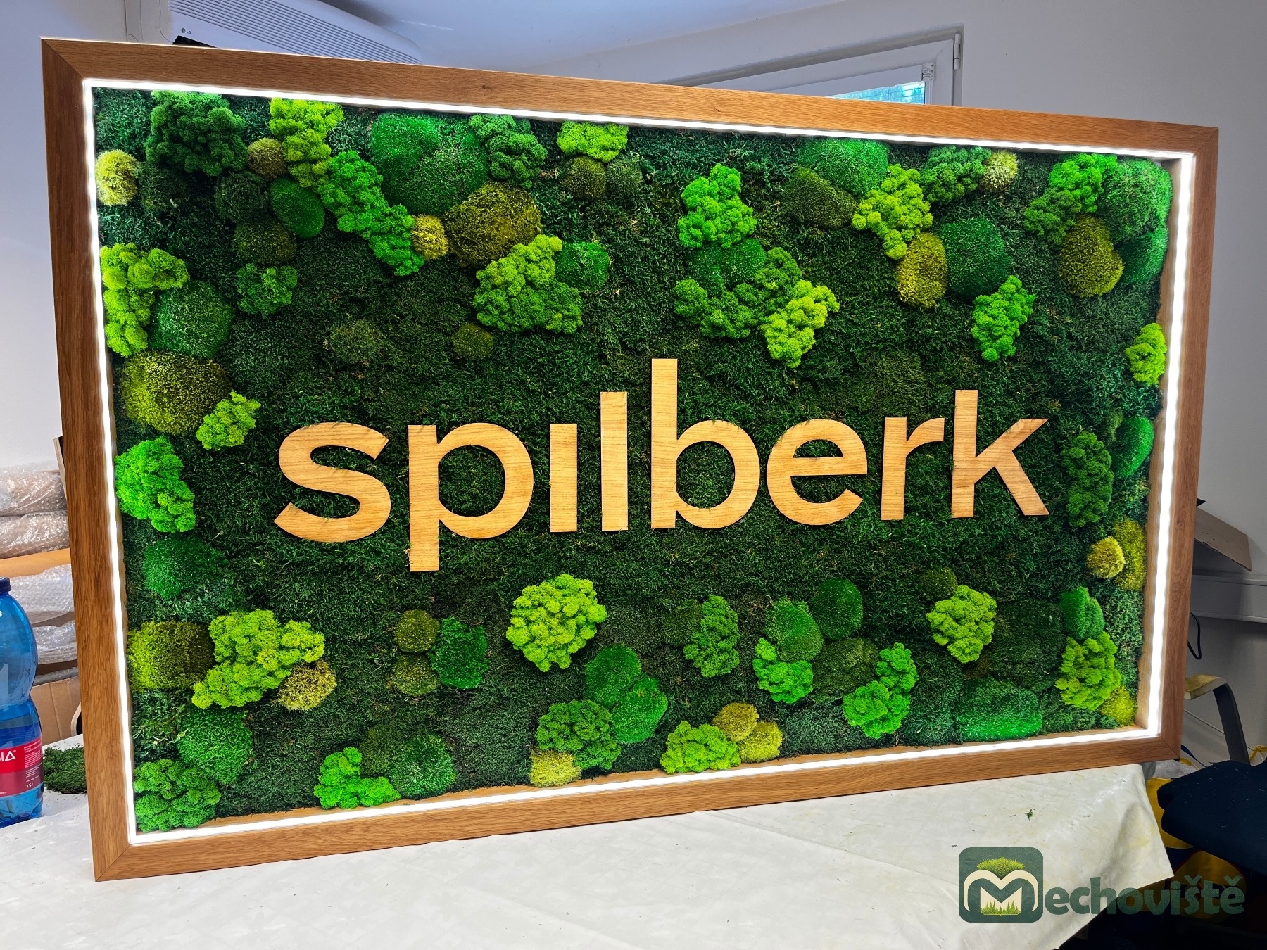 Logo je vyrobeno z dubové překližky, které kontrastuje s jemnou texturou mechu a dodává celému dílu elegantní moderní nádech.