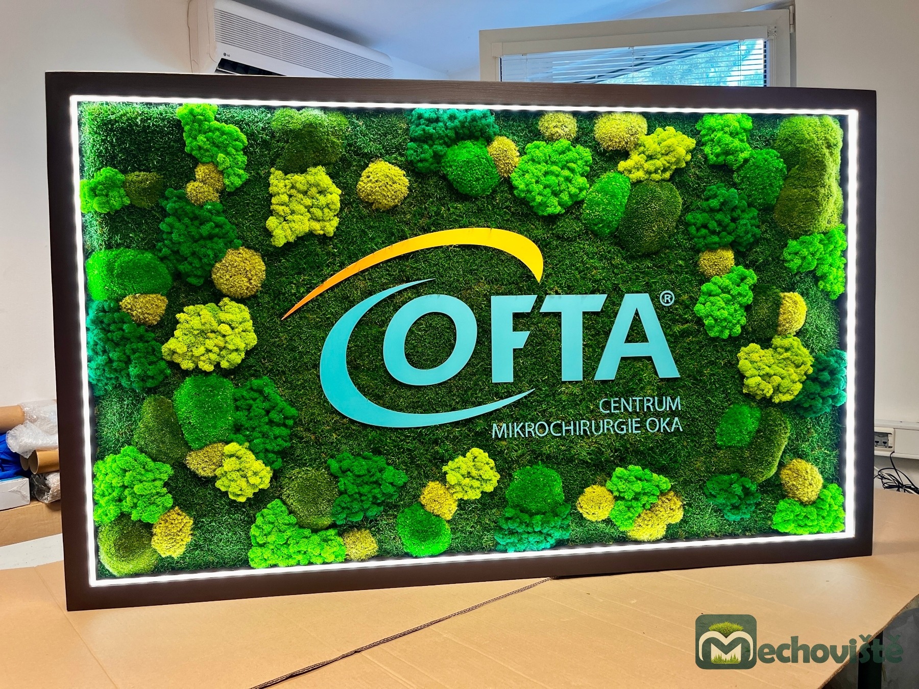 Logo je vyrobeno z leštěného plexiskla ve vašich firemních barvách, které kontrastuje s jemnou texturou mechu a dodává celému dílu elegantní moderní nádech.