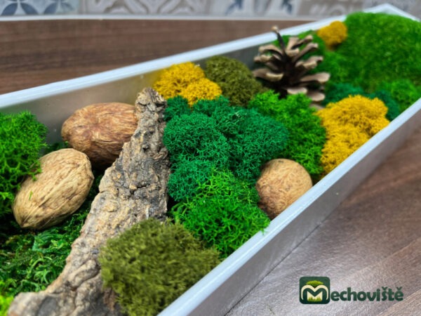 Mechová mísa se krásně vyjímá jako přírodní dekorace na stole, komodě apod. Šišky dodávají mechu svěží nádech lesa a do dekorace přidávají další zajímavý prvek. Jejich barva krásně ladí s přirozenou barvou mechů. Ošetřená kůra a ořechy skvěle doplňují dekoraci a dohromady tvoří designový prvek, na který se budete stále dívat.
