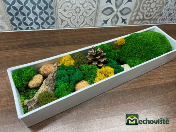 Mechová dekorace v bílé PVC míse. Použit prémiový kopečkový a plochý mech. Součástí jsou také borové šišky, ošetřená kůra a ořechy Amra. Dostupné ve dvou velikostech.