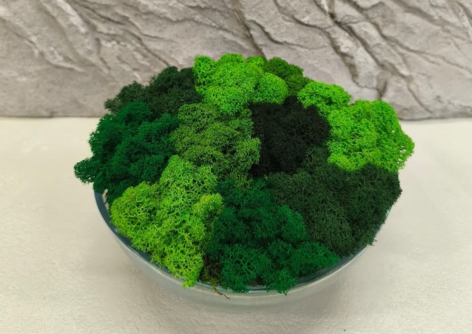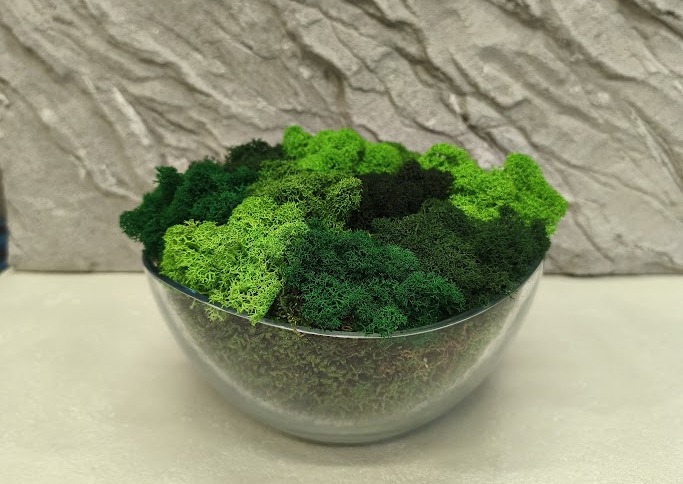 Zajímavá mechová dekorace ve skleněné míse. Obvod skleněné nádoby je vyplněn plochým mechem a její vnitřní prostor zase několika odstíny sobího mechu.