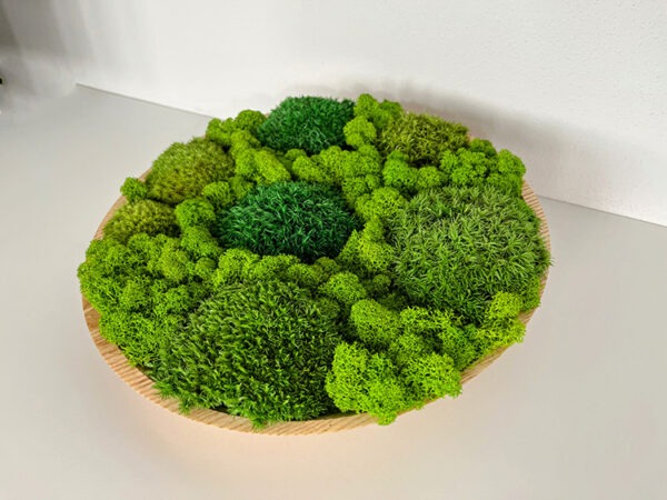 Na zakázku soustružený nádherný tác z jasanového dřeva jsme osadili třemi druhy kopečkového mechu a světle zeleným sobím mechem.