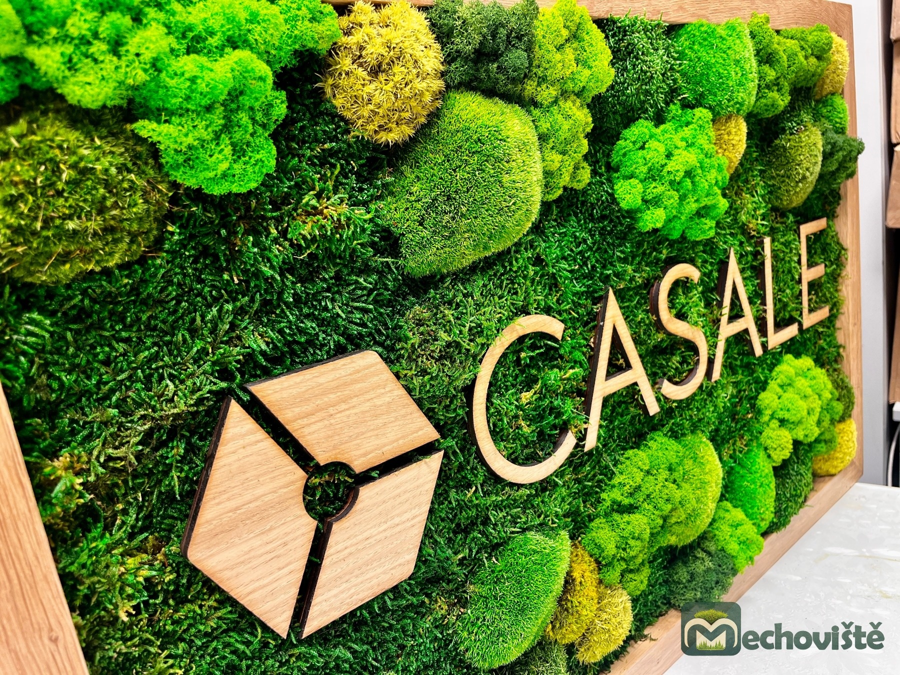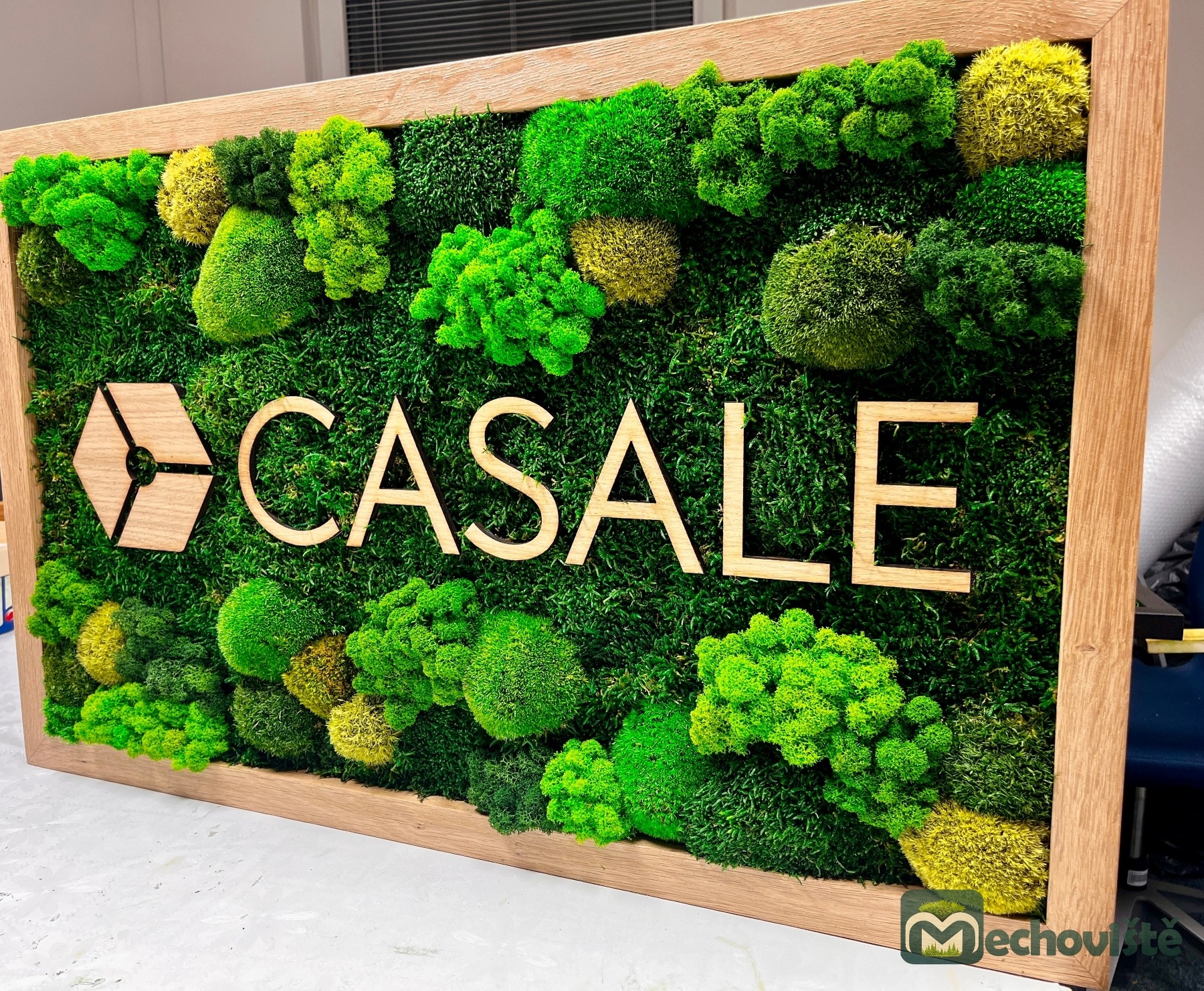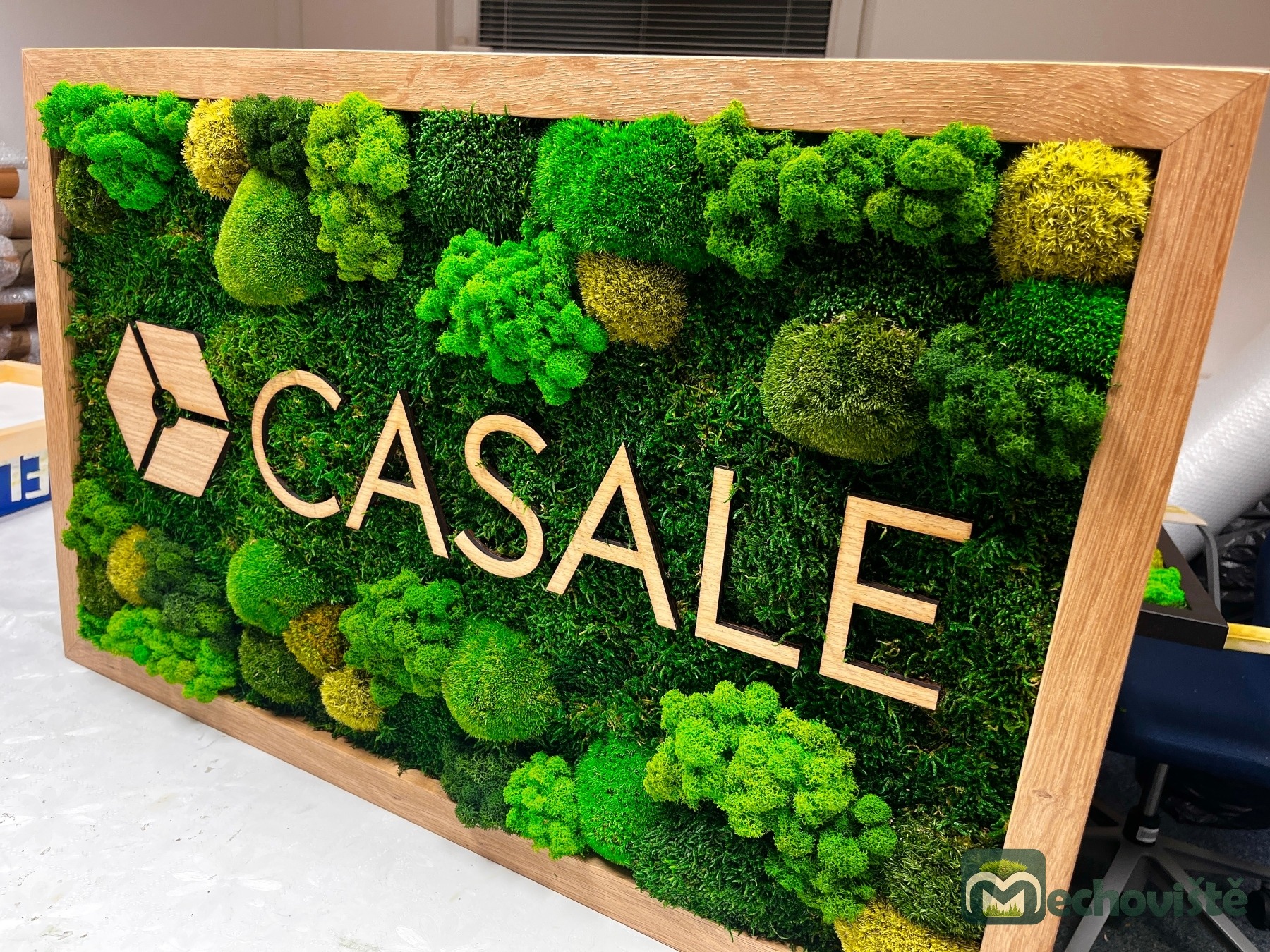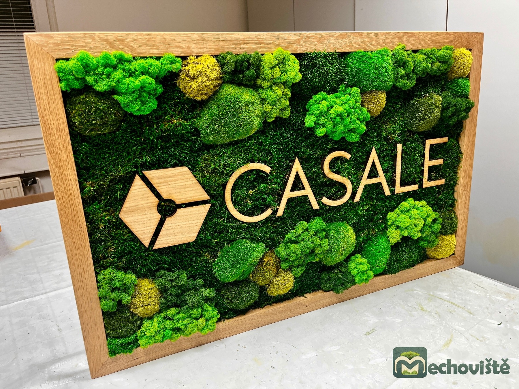 Logo je vyrobeno z dubové překližky, které kontrastuje s jemnou texturou mechu a dodává celému dílu elegantní moderní nádech. To vše je zasazeno do masivního dubového rámu.